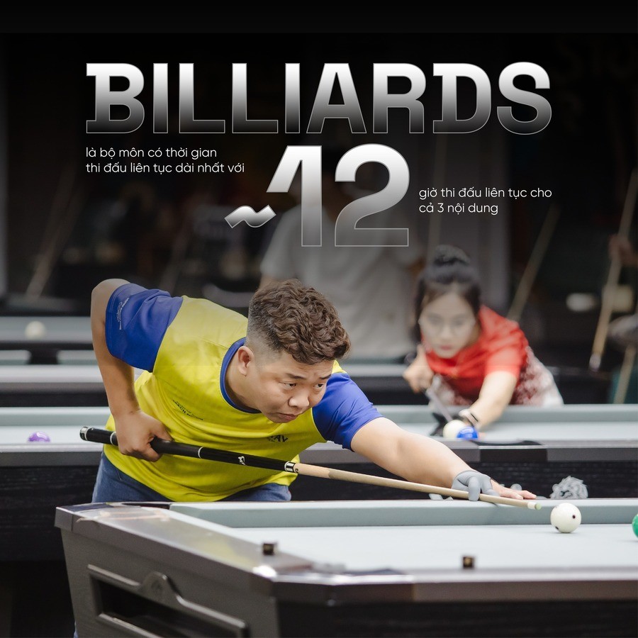 Billiards là bộ môn có thời lượng thi đấu liên tục dài nhất, với gần 12 giờ cho cả ba nội dung, thể hiện sự tập trung cao độ và tinh thần nỗ lực bền bỉ của các vận động viên.