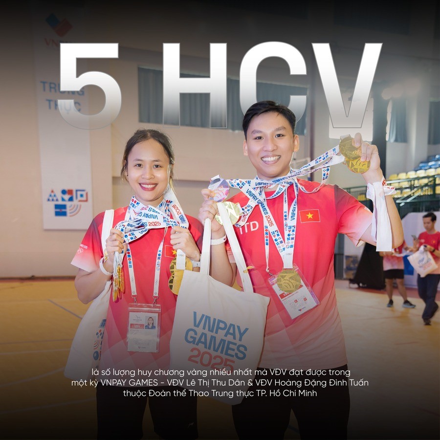 Hai vận động viên Lê Thị Thu Dân và Hoàng Đặng Đình Tuấn xuất sắc giành tổng cộng 5 huy chương vàng, trở thành những vận động viên có thành tích nổi bật nhất tại một kỳ VNPAY GAMES.